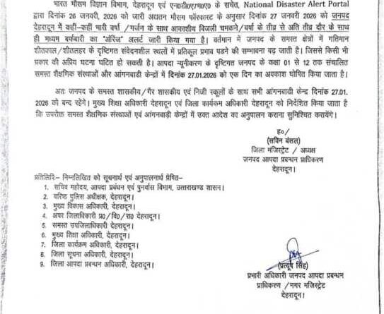 भारत मौसम विज्ञान विभाग, देहरादून एवं एन०डी०एम०ए० के सचेत, National Disaster Alert Portal द्वारा दिनांक 26 जनवरी, 2026 को जारी अद्यतन मौसम फॉरकास्ट के अनुसार दिनांक 27 जनवरी 2026 को जनपद देहरादून में कहीं-कहीं भारी वर्षा / गर्जन के साथ आकाशीय बिजली चमकने / वर्षा के तीव्र से अति तीव्र दौर के साथ ही मध्यम बर्फबारी का ‘ऑरेंज’ अलर्ट जारी किया गया है। वर्तमान में जनपद के समस्त क्षेत्रों में गतिमान शीतकाल / शीतलहर के दृष्टिगत संवेदनशील स्थलों में प्रतिकूल प्रभाव पडने की सम्भावना बढ़ जाती है। जिससे किसी भी प्रकार की अप्रिय घटना घटित हो सकती है। आपदा न्यूनीकरण के दृष्टिगत जनपद के कक्षा 01 से 12 तक संचालित समस्त शैक्षणिक संस्थाओं और आंगनबाडी केन्द्रों में दिनांक 27.01.2026 को एक दिन का अवकाश घोषित किया जाता है।